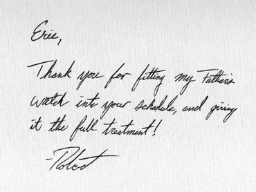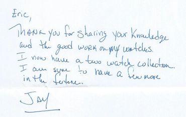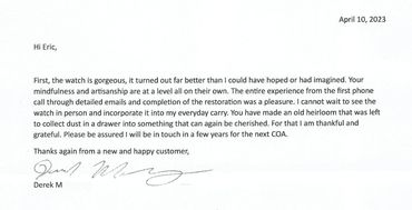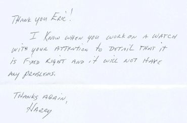 "Just wanted to compliment Eric on the work and customer service ... the quality of service and communication was outstanding ... the watch looks super and runs perfectly ... the level of service that was provided is missing from most online services today ... such a pleasure doing business with you."