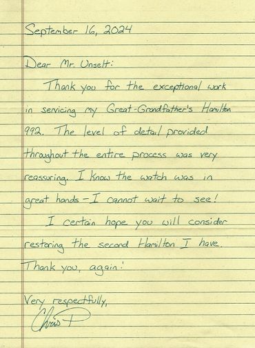 "I sent my Hamilton Model 23 to American Timekeeper for a cleaning and whatever else it might have needed. When I got it back I was completely satisfied. Eric did an excellent job and communicated with me in every step of the process. Thank you, American Timekeeper. I will be using them again."