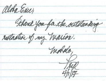 I concur 100% with the other reviews. What stood out first for me was Eric's knowledge. This man definitely knows his stuff and has no problem sharing that knowledge. The cost matched what was laid out on the website with no surprises, and Eric kept me apprised throughout the restoration process. Five Stars without hesitation!"