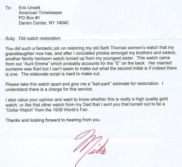 "I knew nothing about pocket watches prior to visiting the American Timekeeper site. I found a Seth Thomas in my deceased Father's desk. The site had lots of information that enabled me to determine what I had. Eric was able to further determine the year of manufacture and provide other details. This was all before I had committed to have a restoration performed.