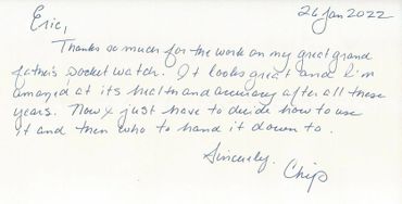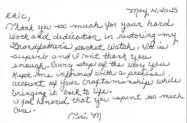 "Eric expertly repaired my antique pocket watch when I couldn't find anyone else to do it at a very reasonable price. He corresponded with me regularly, provided information about the repair, as well as historical information on the watch, and treated it as it was to me - a precious family heirloom. I can't recommend Eric enough."