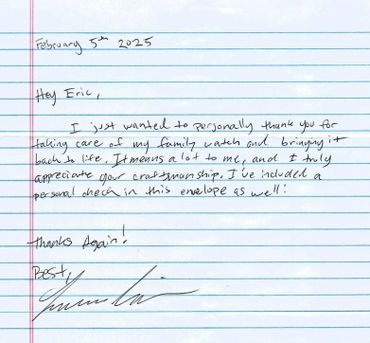 "I have never been so excited to see one of my collection come back to life. This one will be the most rewarding. I did a lot of research on different watchmakers and after a two-month search I finally decided on American Timekeeper. Eric did not disappoint by keeping me engaged throughout the whole restoration process with amazing communication. I'm happy to say he is now my watch guy."