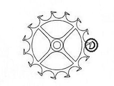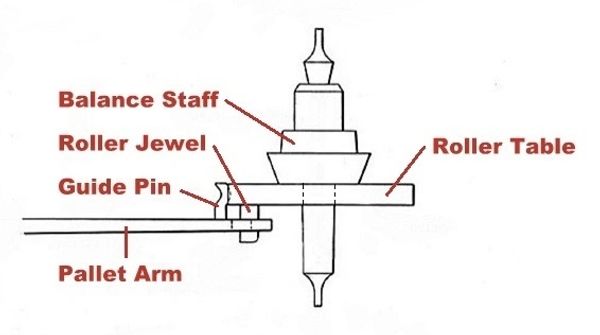 Any anchor or lever escapement requires a roller jewel, which is mounted in the roller table. On every cycle of the balance wheel this jewel gives an impulse to the pallet fork via the cup at the end of the pallet arm. A guide pin behind the cup prevented the pallet fork from drifting too early by meshing with a crescent-shaped cutout milled in the edge of the roller table.