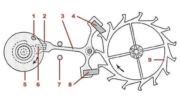 The earliest form of escapement. The paddles on the balance staff allowed the crown wheel to rotate, but it was also metal-on-metal.