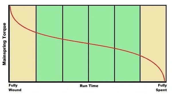 The intent of stopworks was isochronism, the ability of a watch to run at the same rate despite any changes in its power source. The red line in this graph shows the drive torque of a mainspring, and the stopworks allowed the movement to run only in the middle two-thirds of its linear force, where its power was most consistent. While the accuracy may have been slightly improved, stopworks also reduced the run time on a 40-hour spring from roughly 35 hours in real time down to 24 hours.