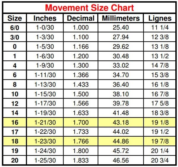 American watches used the Lancashire gauge, which is based on the dial plate of a O-size watch measuring precisely a standard inch in diameter as a starting point, with each ascending size adding exactly 1/30th of an inch. The additional 5/30 inches was for the mounting shoulder up to a 16-size watch, when the diameter was increased to 6/30 inches.