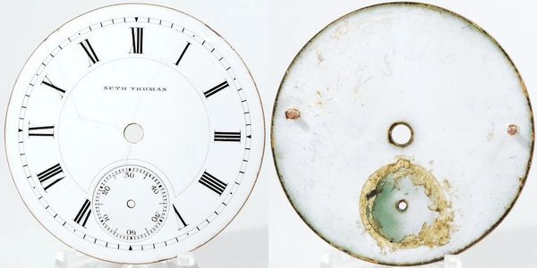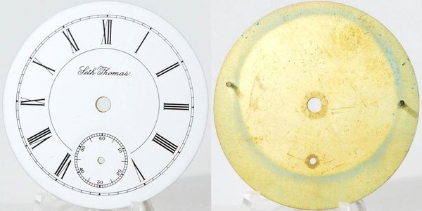 18-size double-sunk private label Roman dial for a Simon Stahl from Gorham, New Jersey with feet at 17, 37 and 53 minutes. Light hairlines.