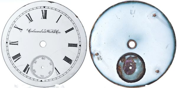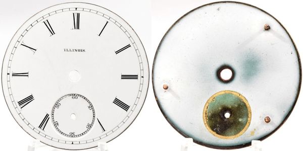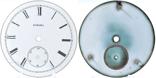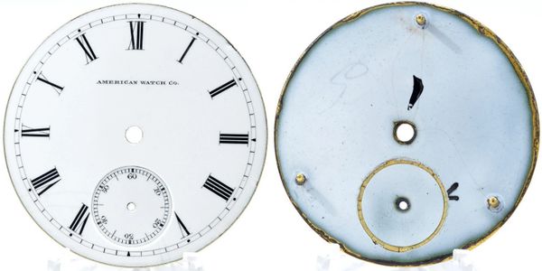 Very early 16-size single-sunk porcelain-enamel Roman dial with the American Watch Co signature. Feet are at 19, 39 and 59 minutes.