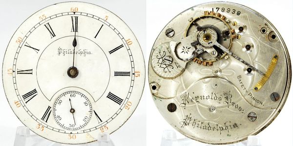 Private label 18-size 11-jewel Columbus hunter for Philadelphia jeweler Reynolds Brothers. Missing the setting lever and the mainspring does not build tension, but the balance staff appears good. The dial looks to be in exceptional shape and the hour hand is correct. S/N 178938.