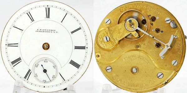 Early 18-size 15-jewel lever-set Model 2 Columbus hunter, running fairly well but could use a proper servicing. Gilt movement has a complete regulator and an excellent private-label dial for a C P Swanson in Jamestown, NY. S/N 35976.