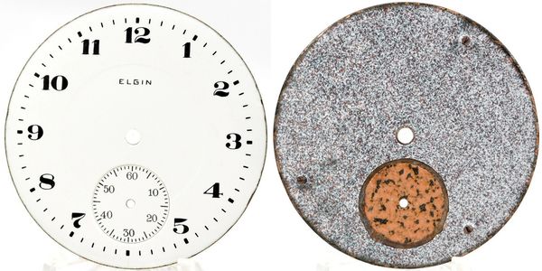18-size single-sunk Roman dial for all Models 1 and 4, and early Models 2 and 3 with feet at 13 and 45 minutes. Light hairlines.