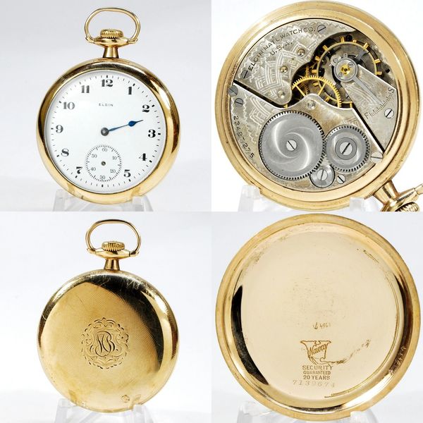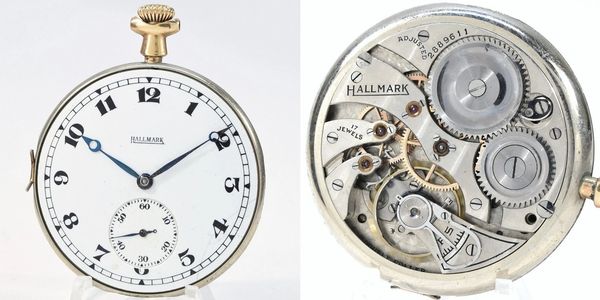 Fairly low production totals 12-size 17-jewel pendant-set Grade 505 Hallmark with a correct dial and a full set of matching hands. Running nicely, but a gold hog apparently felt compelled to tear off the outer shell of the case. S/N 2889611.