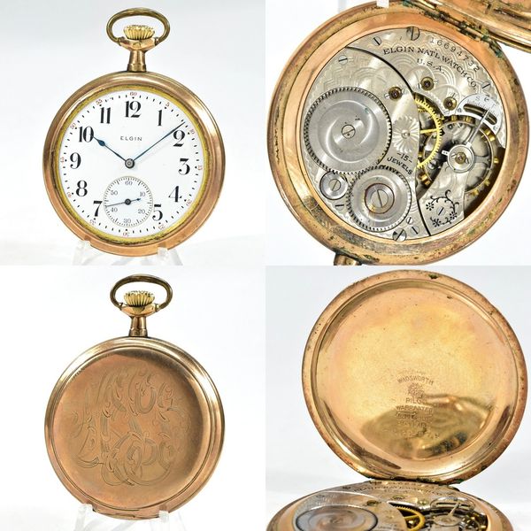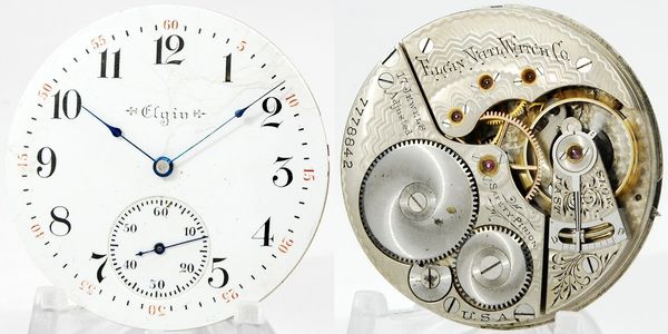 18-size 15-jewel lever-set Grade 82 Elgin hunter with a blown mainspring but a good balance staff and a full set of blued hardware. The Roman numeral dial has a minor edge chip at the 12:00 position but all three hands are correct. S/N 1767261.