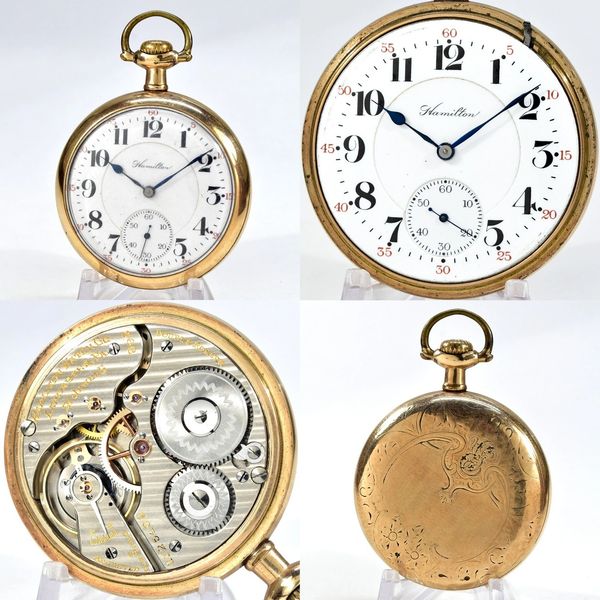 21-jewel 16-size 2nd-model lever-set Hamilton 992, running fairly well but could doubtless use a proper cleaning. The double-sunk Arabic dial appears flawless behind blued spade-and-poker hands, and the case is a 20-year gold-filled South Bend. S/N 1125402.