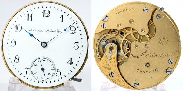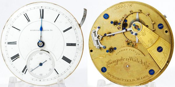 16-size 17-jewel lever-set Hampden hunter with a good balance staff and matching case screws but has a blown mainspring. The double-sunk Arabic dial is in nice shape. S/N 2072748.