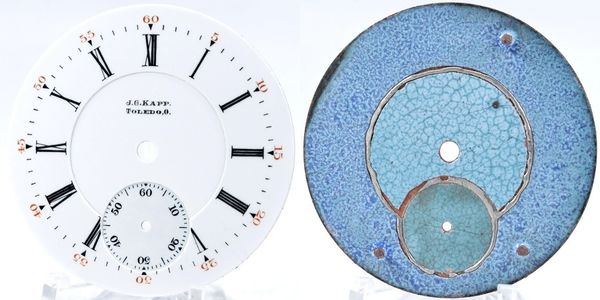Flawless 16-size double-sunk private-label Roman dial for a J G Kapp from Toledo, Ohio with feet at 25, 36 and 56 minutes.