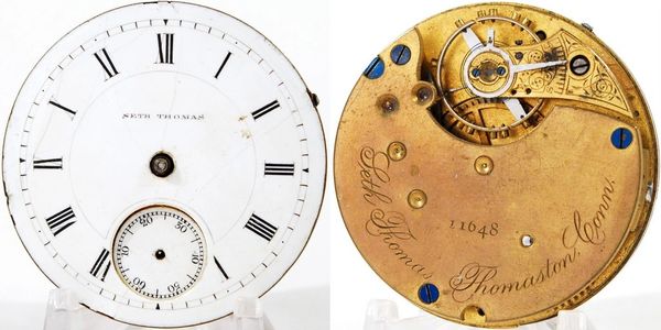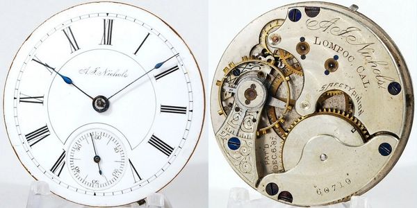 Rare California private label for an A J Nichols, the only CA PL logged at Seth Thomas Research. 18-size 15-jewel Grade 152 with a broken balance staff and the mainspring does not build tension. Excellent matching dial and all three hands are correct. S/N 60719.