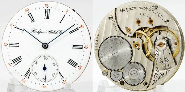 16-size 17-jewel lever-set open-face Grade 575 Model 2 Rockford, running weakly but could definitely use a thorough cleaning. Correct single-sunk dial with the cursive signature has several light hairlines. S/N 567364.
