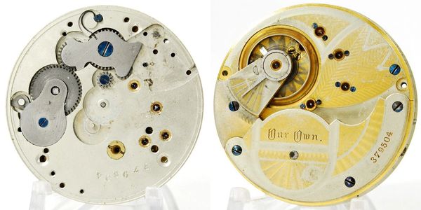 18-size 16-jewel lever-set two-tone hunting Model 8 with a very interesting private label marking of "Our Own". Running weakly, so it has a good staff and mainspring but the center post has been sheared off at the plate. S/N 379504.