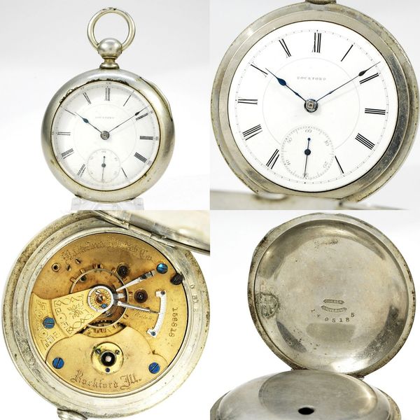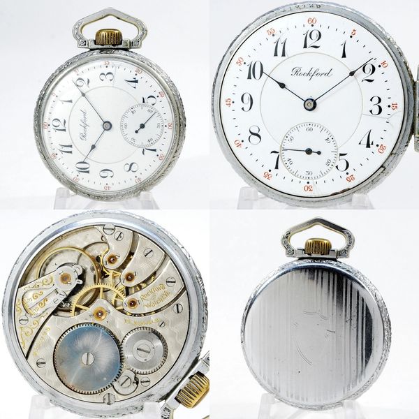 18-size key-wind 9 or 11-jewel Rockford in its original Dueber nickel-silver hinged case. The balance staff is blown but the mainspring has tension, the dial is excellent and all three hands are correct. S/N 156818.