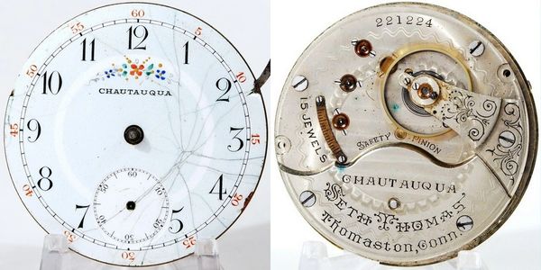 Rare 15-jewel 18-size Grade 204 in the Chautauqua grade, presumably for the Chautauqua Institute in New York. Only eight have been logged and only three with matching dials at Seth Thomas Research. Running weakly and definitely needs servicing. S/N 221224.