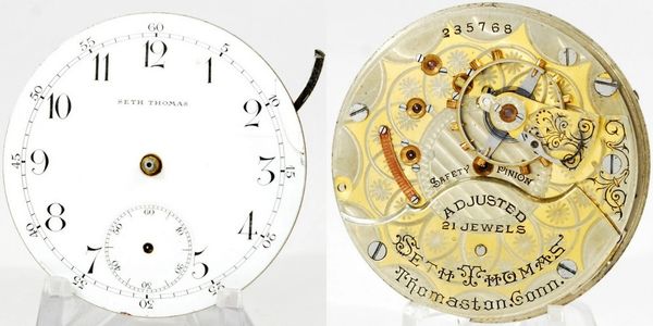 Scarce 18-size 21-jewel lever-set Grade 291 Seth Thomas with a good balance staff and mainspring but but is too gummy to run. The two-tone pattern is fairly bright and the 4th pivot is intact. The total production was 1,100 pieces in four separate runs. S/N 235768.