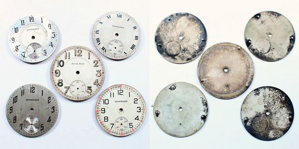 Five metal dials for 12 and 16-size South Bend and their Studebaker grade. All dial feet are intact.