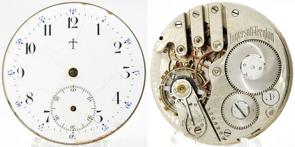 16-size 7-jewel pendant-set open-face Model 3 Ingersoll-Trenton. Blown balance staff but the mainspring has tension. Distinctive blue and black Arabic dial has some mild edge chipping but the fourth pinion is intact. S/N 3266203.