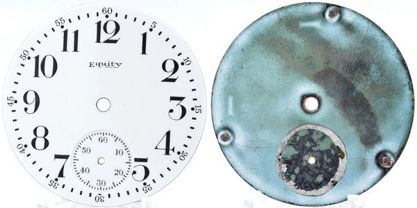 Flawless 16-size single-sunk porcelain-enamel Arabic dial for Waltham's Equity line with feet at 18, 39 and 58 minutes.