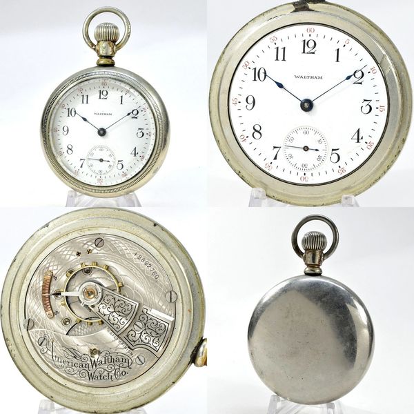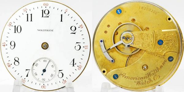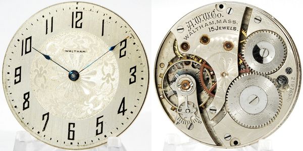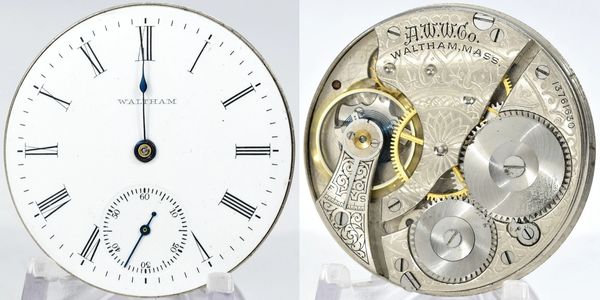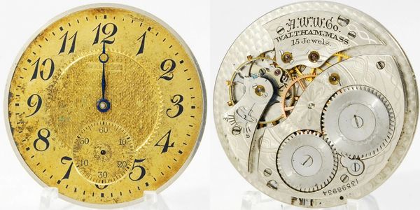 12/14-size 15-jewel pendant-set open-face Waltham with a good staff and mainspring, but is too gummed up to run. Art-Deco metal dial and correct hour hand are still there. Add a case and you've got a great pre-WWI carry watch. S/N 13598934.