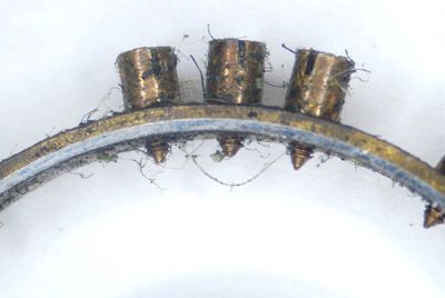 One of the first things to break on a watch because of an impact is the balance staff and the four jewels in which it rotates. The brass cap jewel in this photo is in itself not a big problem, but it's a clue, since anyone lazy enough to use a brass jewel instead of a gold one to match the other plate jewels will usually take shortcuts elsewhere.