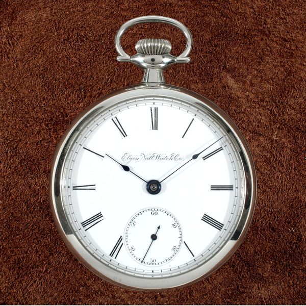 One of the early grades offered by the the Elgin National Watch Co was the G M Wheeler, named after George Montague Wheeler, West Point graduate and cartographer in the southwest United States. It's not a common grade, and far fewer of them were produced when compared to the B W Raymond grade, a tribute to the company's first president. This original example is a perfect carry piece, freshly cleaned and oiled for the next owner, still with all of its fifteen factory jewels, dust shells and a full set of conical blued screws . It fronts a correct and snow-white single-sunk dial with the full cursive signature behind blued light spade hands. It's housed in a base-metal Keystone case with a French bow and a sharp crown, which was converted to display to eradicate some deep scratches using new beveled glass crystals on both front and back bezels. Matching lanyard and display stand included.