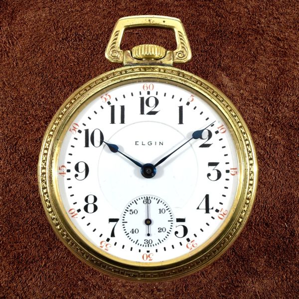Relatively few of Elgin's full-plate lever-set Model 7s bore a number for a grade designate, instead bearing the names of those who had much to do with the company's founding such as Howard Z Culver, Benjamin W Raymond, and George M Wheeler. In fact, Wayne Schlitt's superb Elgin website lists only nine numbered grades in total for 18-size open-faced watches, including the 21-jewel adjusted-to-five-positions No 349. This exceptional example is an entirely original piece, meaning that the movement, case and dial have been together since the very first customer walked into his local jeweler's and bought it. All twenty-one jewels are in gold settings and are still intact, an increasingly rare thing in these days, and it was just disassembled and thoroughly cleaned for its next owner. It fronts a snow-white double-sunk Arabic dial and correct blued hands, and is housed in a yellow base-metal Keystone case that was converted to display to show off this impressive movement. The bow is still tight, the crown is still fairly sharp, and NOS glass on both sides completes it. Matching lanyard and display stand included.
