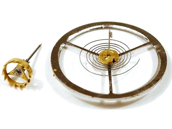 This photo shows a balance wheel positioned out of parallel with with the gear train plate. This was a factory defect - the balance jewel pockets were not located or aligned properly.